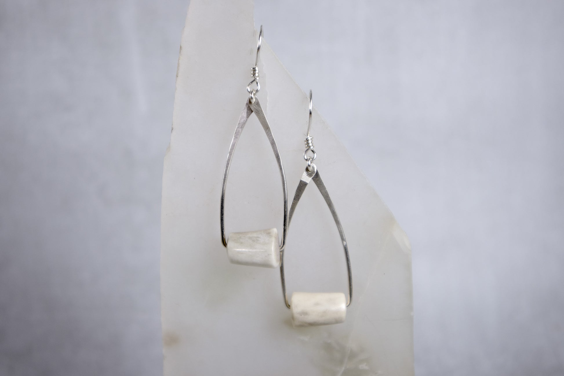 These gorgeous, yet simple, earrings feature beads made of deer antler, hanging from a modern arch of sterling silver. The silver has a subtle satin finish that contrasts nicely with the antler. These gorgeous earrings hang at 2.5" long. ** Due to the organic nature of the Antler beads on these, the item you receive may vary slightly from the image**