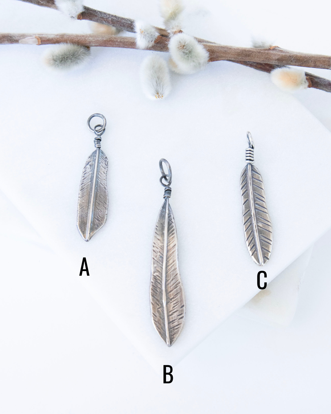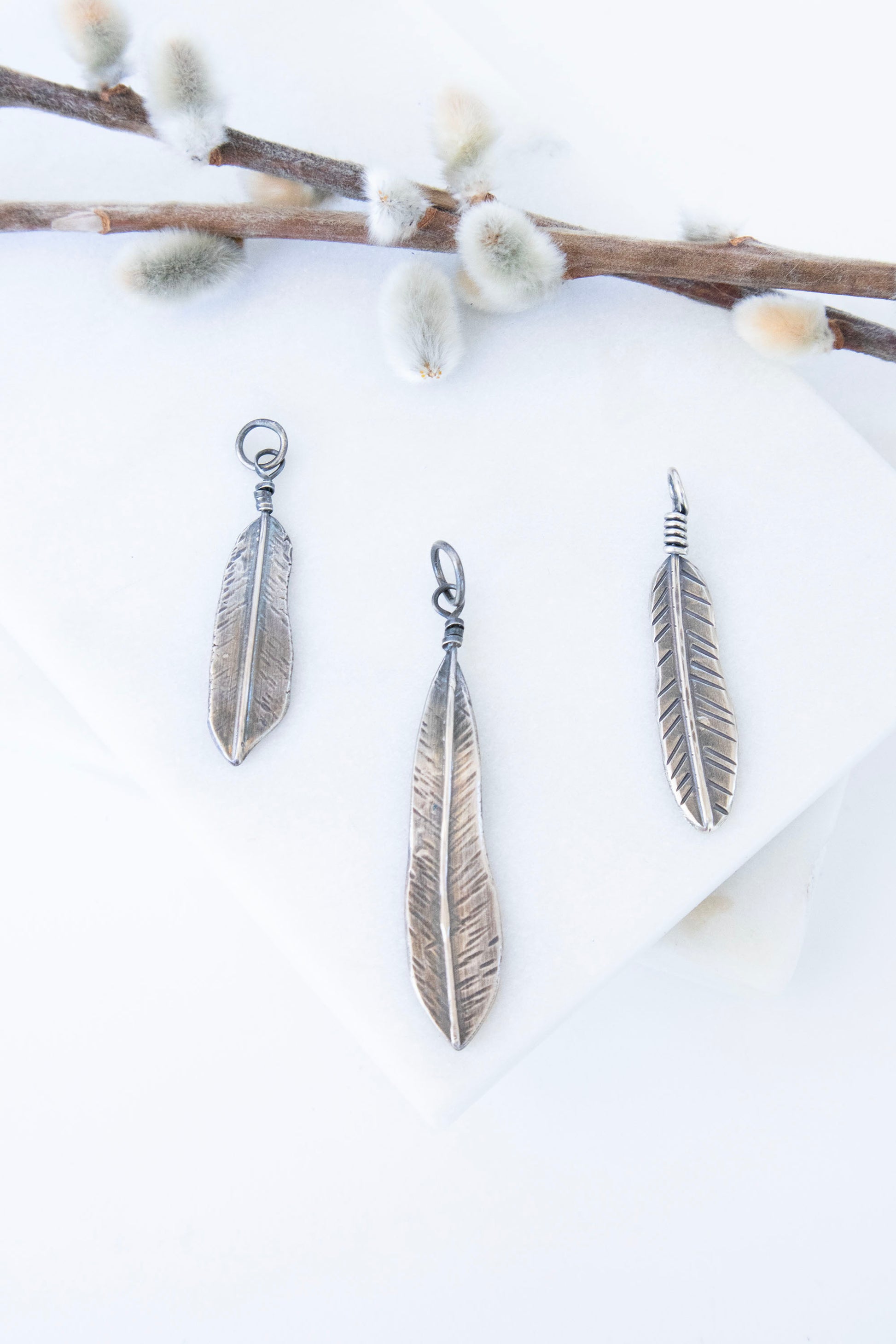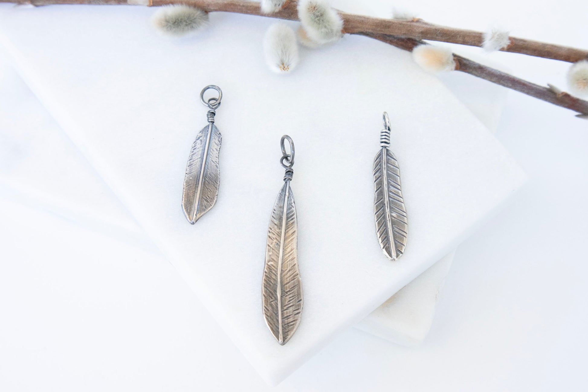 These Feather Charms have each been hand-forged from recycled sterling silver. Each one is slightly different, and one-of-a-kind. These make great pendants by themselves, or charms to add to a story necklace. Please select which charm you would like from the drop down.