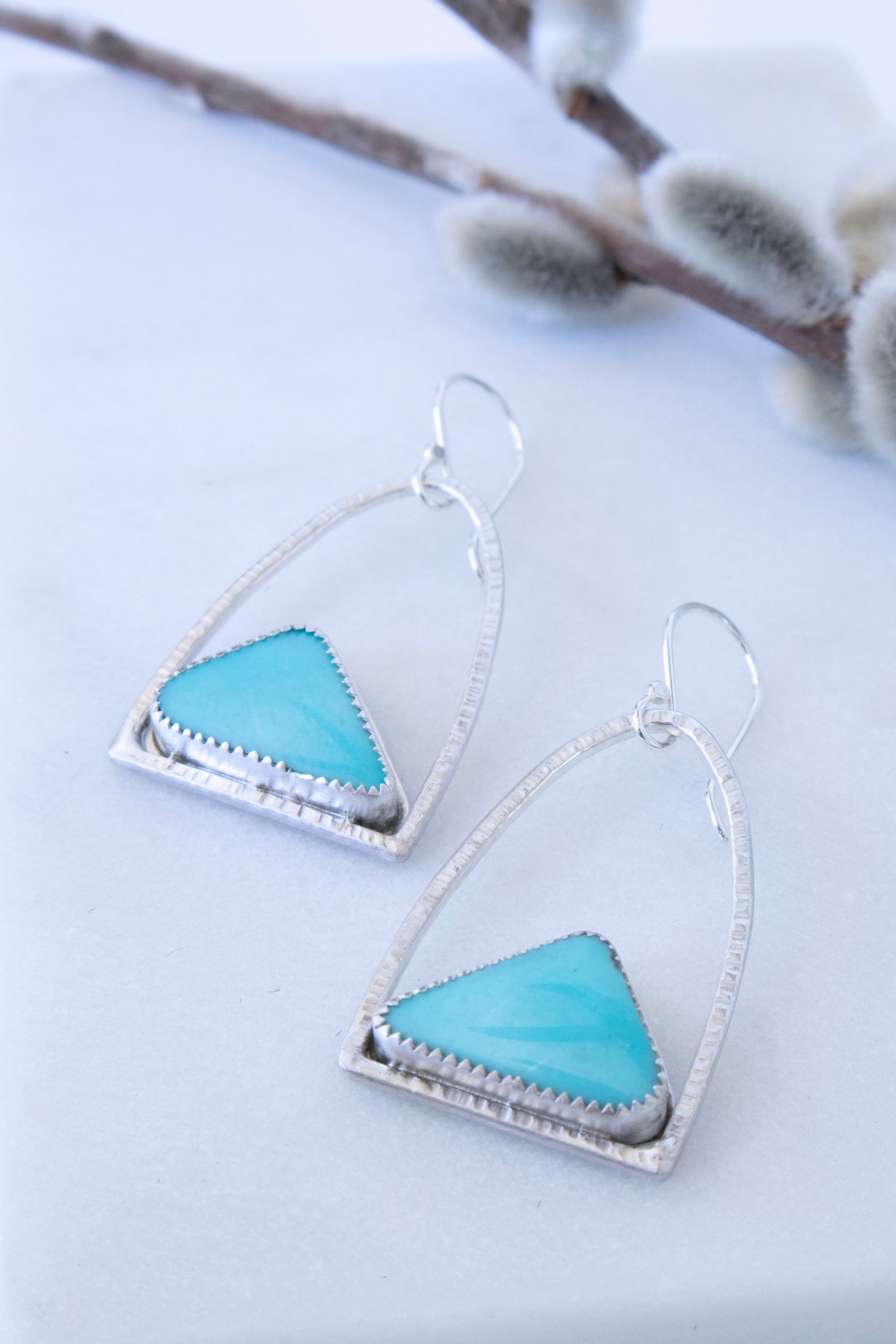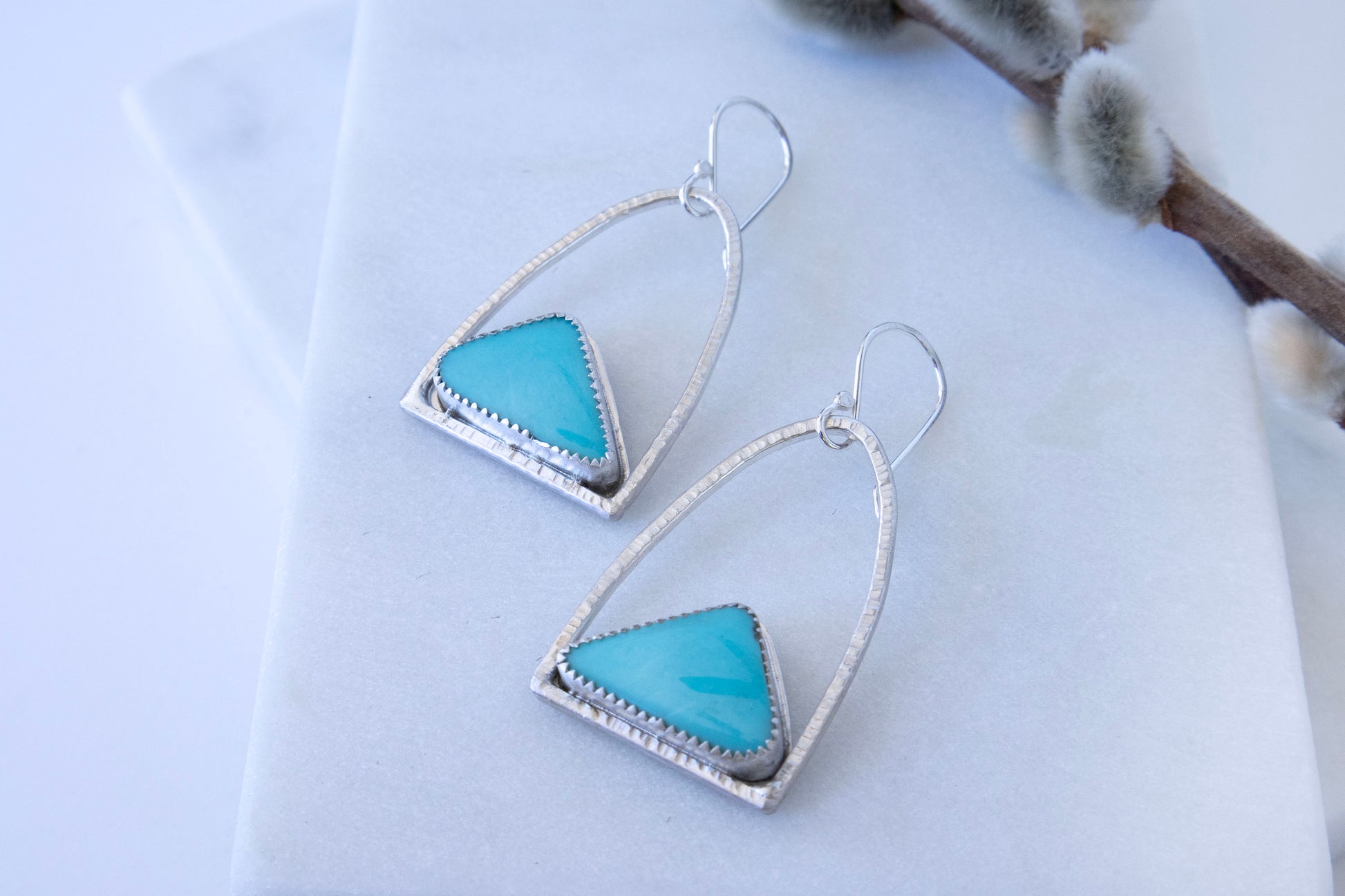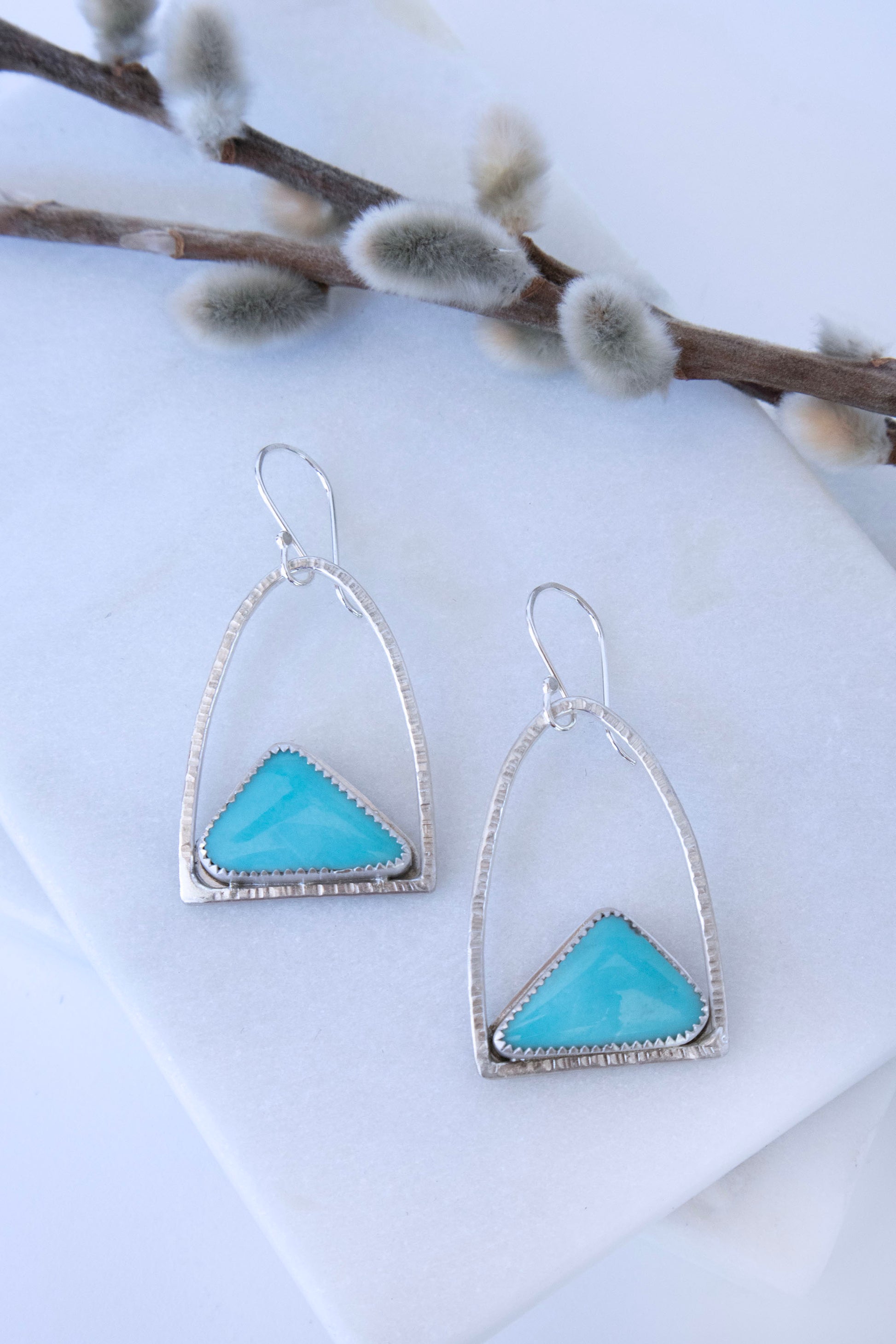 Inspired by the mountains surrounding us, these fun earrings feature bright Sleeping Beauty Turquoise set in bright Sterling Silver. These hoops have great movement and are perfect for summer!